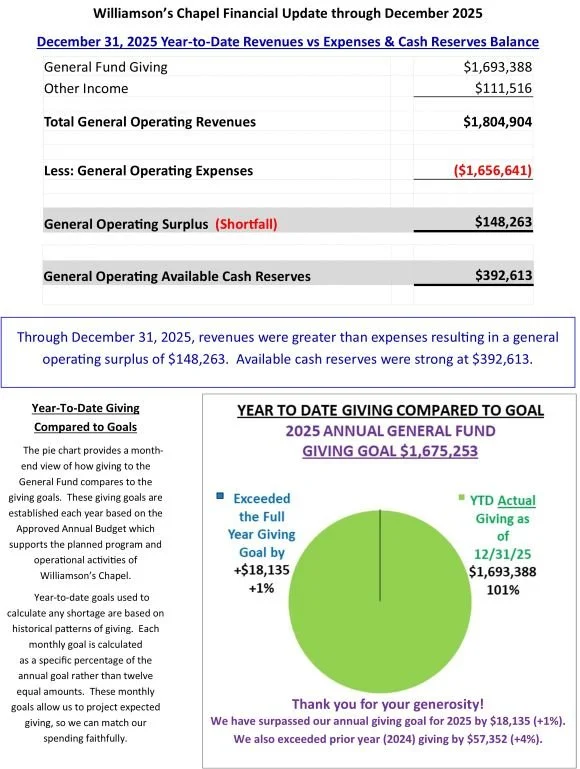 One of the primary goals of the Financial Ministry team at Williamson's Chapel is to provide transparency and access to our financial information. The most reliable snapshots of financial progress we can offer are comparisons to goals and prior year results. For those who want a more in-depth view, we also include periodic highlights of certain aspects of the financial structure of our church. If you would like additional financial information, please contact us as noted below.